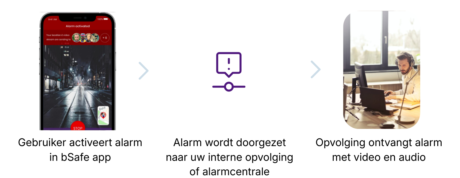 bSafe kan worden gekoppeld aan uw eigen interne opvolging of aan een externe alarmcentrale. Bij activatie ontvangt opvolging realtime locatie en context, inclusief video en audio, zodat er sneller en beter kan worden gehandeld.